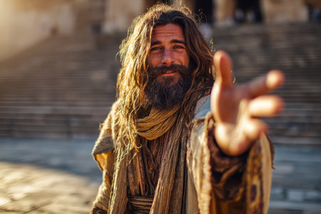 A rugged individual with flowing hair and a full beard extends a welcoming hand amid ancient stone structures and lush greenery, evoking warmth and timeless hospitality.