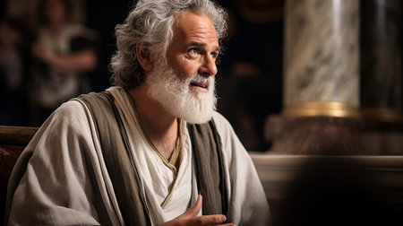 An elderly man with a long white beard and hair stands solemnly draped in a simple white shawl creating a contemplative atmosphere.