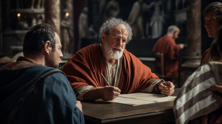 Roman merchant in finely woven toga conducting trade negotiations