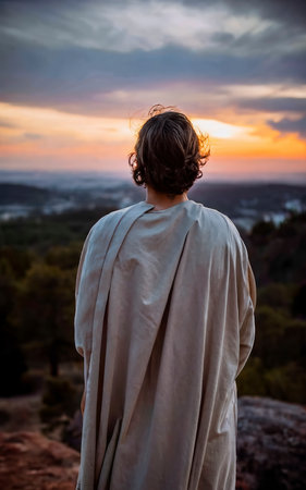 Portrait of Jesus Christ in his traditional white robe against sunset sky background.
