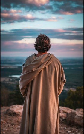 A tranquil figure stands against the glowing twilight of Jerusalem. Draped in deep robes, he gazes thoughtfully towards the ancient city as lights twinkle like stars.