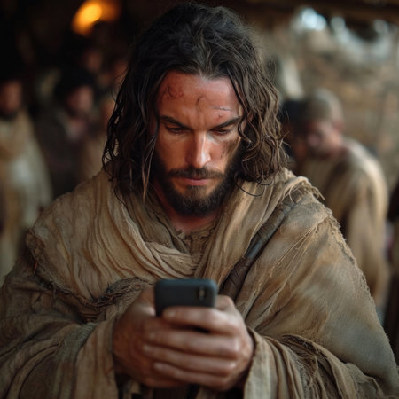 Modern, smartphone and Jesus with idea for religion, fantasy and spiritual networking with tech