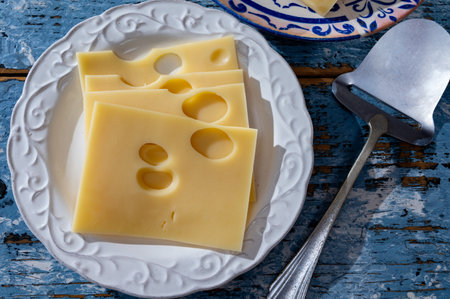 Cheese collection, Swiss emmental or emmentaler with slices of cheese and knife on wooden table in Tuscany, Italy