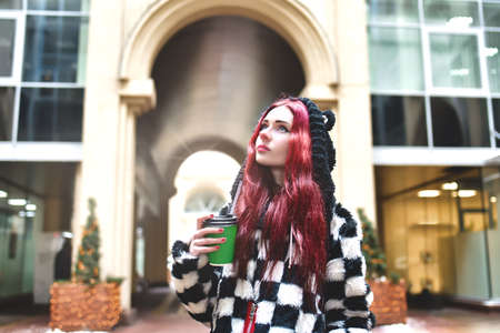 Near portrait of a teen girl with red hair in warm clothes standing outside on a cold day with a cup of coffee in her hands and looks into the camera. Cute girl walking with coffee in her hands and playing with own hair.