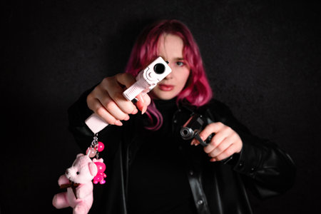 Woman with a pink gun and black pistol with pink hair on a black background in black leather clothes aiming looking at camera.
