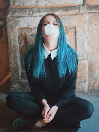 Cute gothic model blows bubblegum. Street punk or hipster woman student with blue colorful dyed hair, piercing,lenses,ears tunnels and unusual hairstyle in backyard.