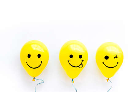 Happiness emotion face on balloon - joy mood background. Top view, copy space