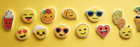 Colorful emoji stickers displayed on a cheerful yellow background showcase a variety of fun expressions, perfect for arts, crafts, and decoration.