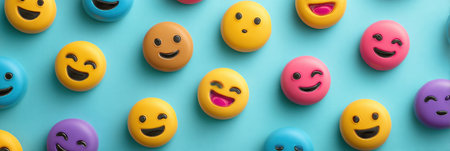Many emoji faces with different expressions are placed on a bright blue background, creating a fun and lively scene filled with color.