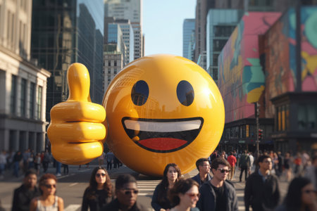 A massive, inflatable yellow emoji with a thumbs-up gesture dominates the scene. It floats joyfully above a crowd, capturing the spirit of a vibrant street festival or parade.