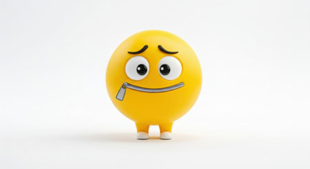 A yellow emoji character with a zipper over its mouth, standing on a white background. It appears to be shy or holding back words.