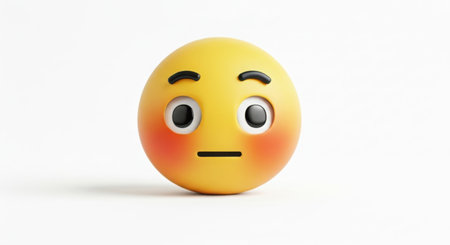 Happy 3D Emoji with Pink Cheeks and Bright Smile on Colorful Blurred Bokeh Background Image.