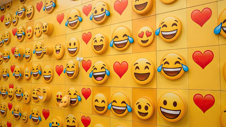 A wall is covered with a repeating pattern of emoji faces and hearts. The emojis are predominantly yellow with various expressions including laughing and smiling. Red hearts punctuate the layout. The composition uses overhead lighting. Suitable for digital design or marketing projects, the image conveys positive emotions.