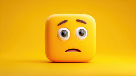 A yellow square character shows a worried expression with big eyes and raised eyebrows. The bright orange background enhances the playful yet expressive theme in this design.