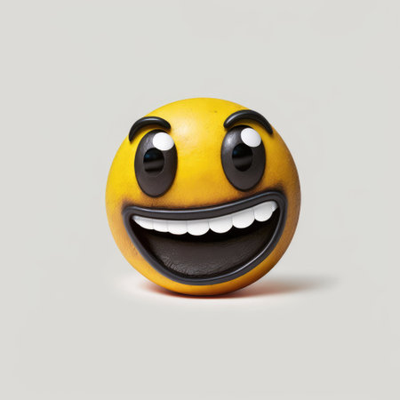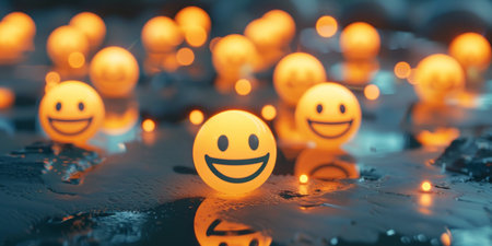 Smiling emojis sit on a dark surface, reflecting their cheerful faces