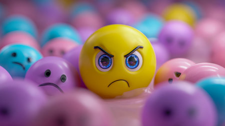A vibrant yellow sphere with an angry expression dominates a cluster of soft pastel faces displaying sadness and concern, highlighting intense emotions amid a sea of subt
