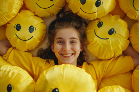 3d illustration of yellow smiley face surrounded by yellow balloons.