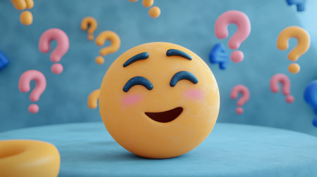 This cheerful emoji features a smiling face surrounded by colorful question marks, creating a playful and vibrant atmosphere perfect for communication and creativity.