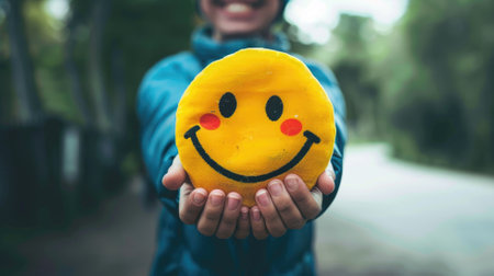 Person holding smiling face cushion outdoors,