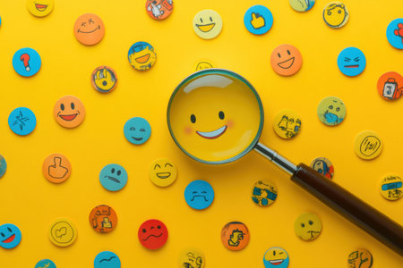 Bright yellow background with various smiley tokens arranged, while a magnifying glass emphasizes a cheerful smiley face in the center.