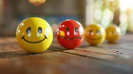 An AI generated illustration of the hands of a person holding small colorful balls with smiley and sad faces