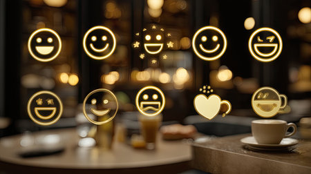A captivating collection of happy emoji icons shines brightly in a cozy caf