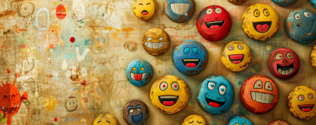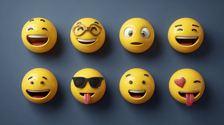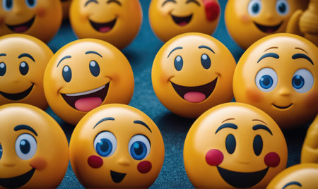 A vibrant collection of cheerful smiley emojis radiating joy and happiness. Perfect for design projects that aim to express positivity and fun.