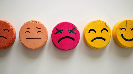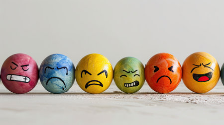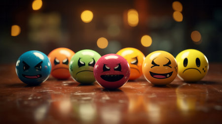 An AI generated illustration of the hands of a person holding small colorful balls with smiley and sad faces
