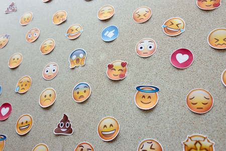TERNOPIL, UKRAINE - APRIL 29, 2022: Large set of stickers with Emoji yellow faces. Emoji is a pictogram or smiley embedded in text and used in electronic messages and web pages