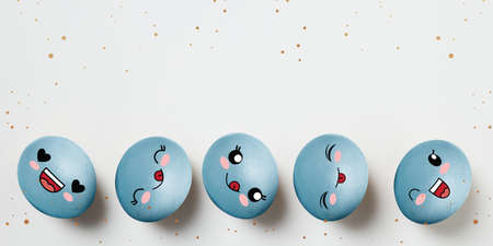 Blue painted funny cute eggs in cartoon style. Happy Easter traditions, mood. Concept of holidays, spring, celebrating, family time, kids, sales