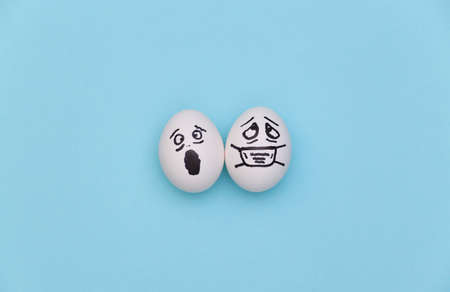 The egg face in a medical mask and scared on a blue background. Covid-19 pandemic. top view