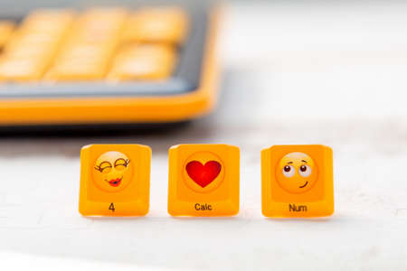 Three buttons with the image of a kiss, heart and embarrassment emoticon on the background of a blurry keyboard. The concept of social networks, communication and emotions.