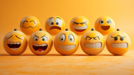 A collection of expressive emoji balls on a bright orange background displays a range of lively emotions