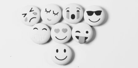 Yellow color various emotions emoji on a black and white background with selected focus on object .