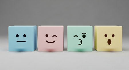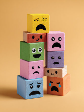 A set of wooden blocks shows faces with different emotions to help build vocabulary in educational settings.