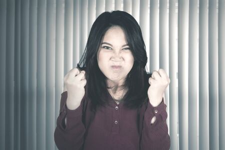 Picture of young woman clenching her fists with furious expression near the window