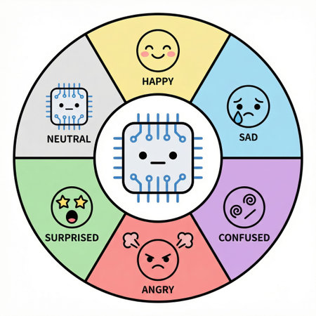 AI emotion wheel displays central microchip face surrounded by six emotive icons and labeled moods on clean white background with available space for text and design overlays. Useful in education and UX demos