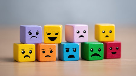 Vibrant wooden blocks display a range of emotions, perfect for educational themes focusing on child development and emotional intelligence.