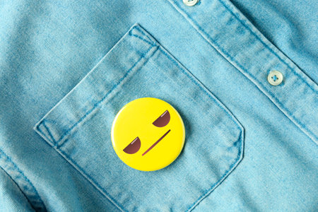Badge with distrustful or displeased face attached to pocket of denim shirt