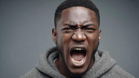 Portrait of a furious young man shouting with rage on a gray background, expressing his anger and frustration