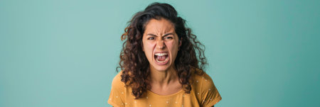 “Young Woman Expressing Anger with Open Mouth Against Purple Background.â€