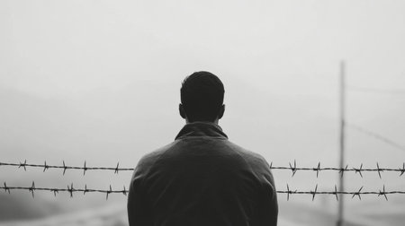 A solitary figure stands behind jagged wire against a fiery sunset, embodying resilience and aspiration amid obstacles in a powerful outdoor tableau.