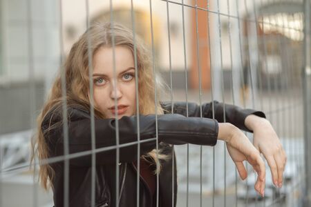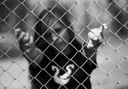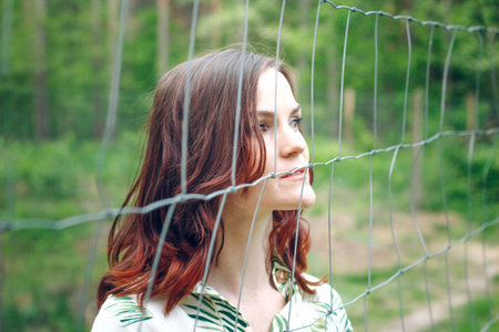 Redhead girl behind a fence outdoors. Psychology, phobias or fears