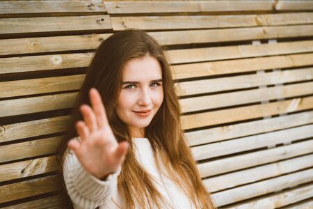 Beautiful young woman with long hair stretches her hand forward to the camera, Caucasian woman sitting on a wooden bench and pulling her arms, empty space for text
