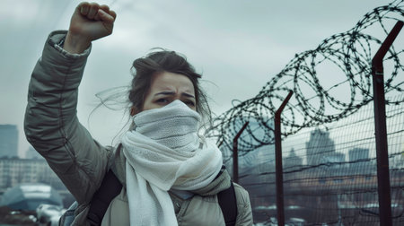 A lone figure stands against a vibrant dusk sky, lifting their arms behind sharp barbed wire, embodied resilience and the longing for liberation amid fading sunlight.