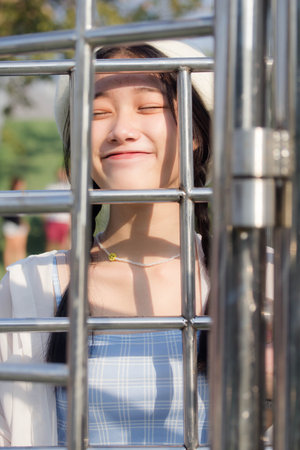 A girl looks at the world through a metal mesh. Infringement of the rights of the child