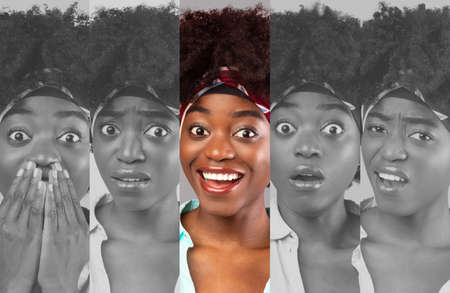 Portrait of african american lady showing diverse emotions, colorful accent on positive face exspression, collage