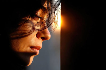 A woman stands near a window, lost in thought as the sun sets. The warm light casts a glow on her profile, highlighting her contemplative expression and flowing hair.