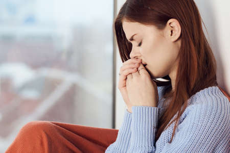 sad woman looking out the window close-up