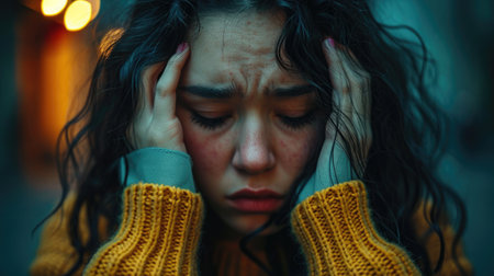 Close-up portrait of a woman with curly hair, displaying emotions of stress and anxiety. She holds her head in hands against a neutral backdrop, illustrating vulnerability.